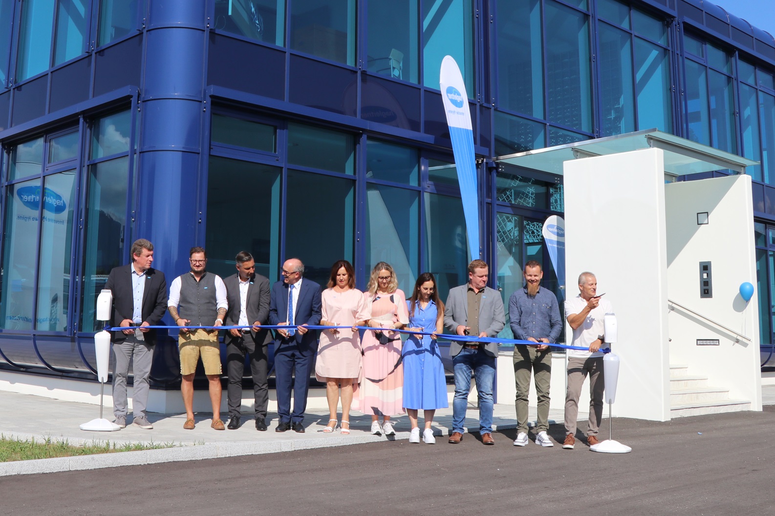 Das neue Vertriebs- und Logistikzentrum verfügt über eine Fotovoltaikanlage, den hauseigenen Strombedarf soll sie bis zu einem Drittel abdecken – im Sommer sei das realistisch, schildert Hans Georg Hagleitner. Zudem stehen Ladestationen für E-Autos bereit. Äußerlich erscheint der Komplex firmentypisch: Weiß gestaltet sich das Warenlager – blau ein gläserner Kubus, er beherbergt Arbeits- und Schulungsräume.
