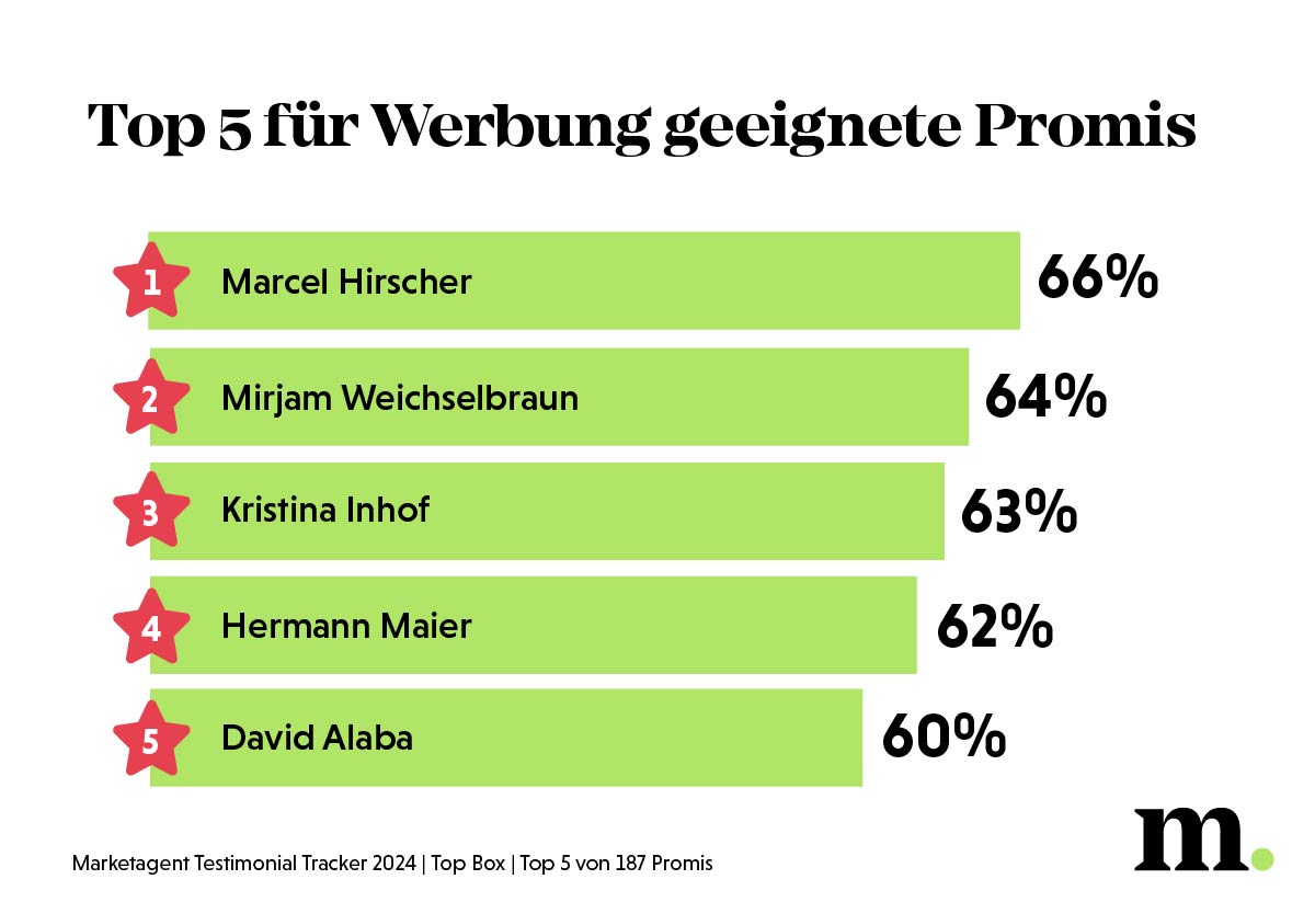Als besonders aussichtsreichen Kandidaten für zukünftige Werbedeals küren die Umfrageteilnehmer*innen Marcel Hirscher. Fast zwei Drittel (65,8%) empfinden ihn als sehr geeignet, um in Werbungen aufzutreten. Auch an Mirjam Weichselbraun kann sich die heimische Bevölkerung scheinbar nicht satt sehen (64,4%). Kristina Inhof (63,0%), Hermann Maier (62,1%) und David Alaba (59,7%) machen die Top 5 der am besten für Werbung geeigneten Promi-Persönlichkeiten komplett.