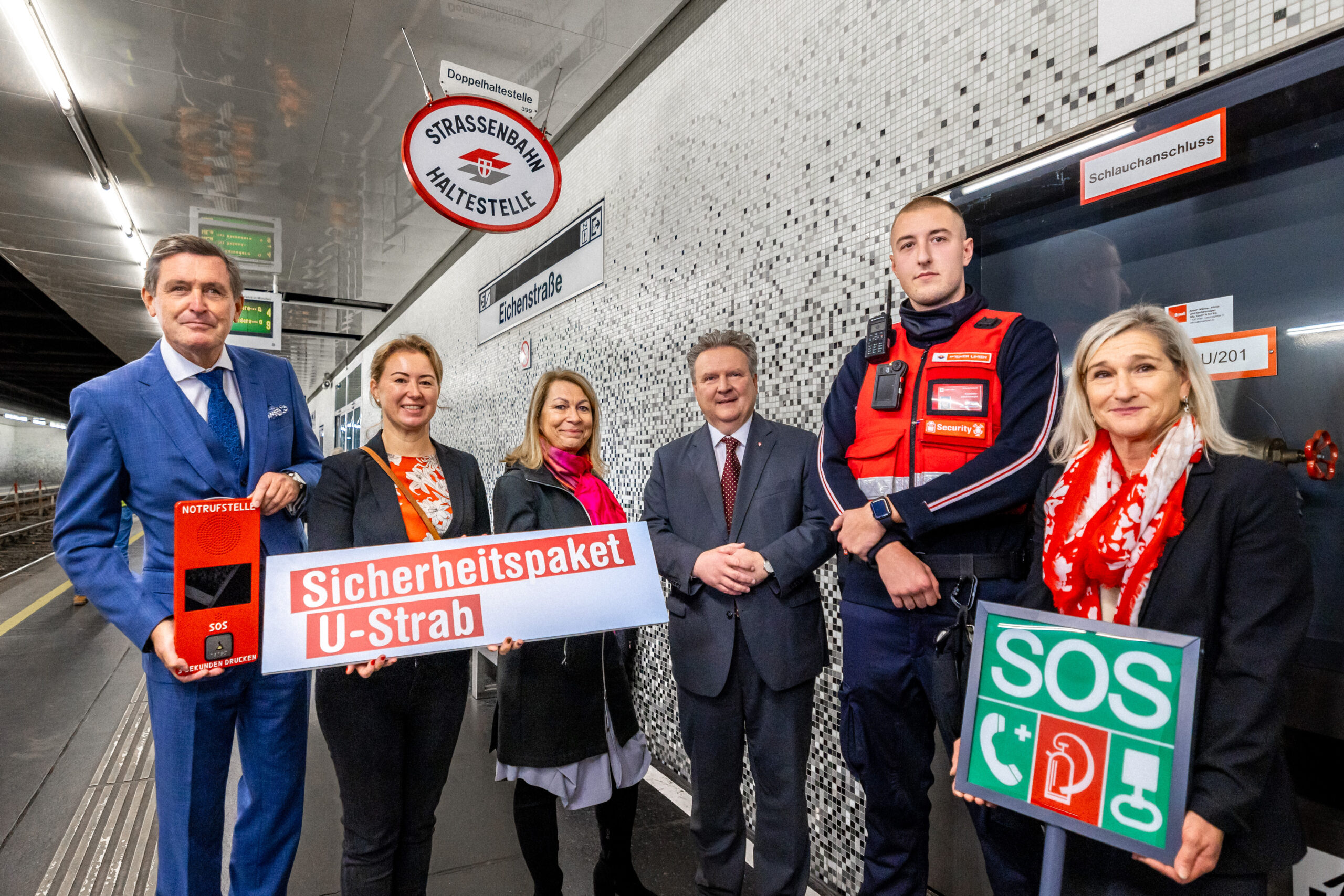 Auf insgesamt 142 Kameras in allen U-Strab Stationen wird künftig das Geschehen festgehalten. Die Kameras zeichnen sowohl in der jeweiligen Haltestelle als auch in Liften, Treppen, Rolltreppen und Passagen auf. Das Bildmaterial wird für mindestens 48 Stunden gespeichert und kann von der Polizei zur Aufklärung von Vorfällen genutzt werden. Ist dies nicht notwendig, werden die Aufzeichnungen automatisch gelöscht. Die Kameras ermöglichen außerdem einen effizienteren und gezielteren Einsatz des Wiener Linien Personals. Weiters werden pro Bahnsteig zwei barrierefreie Notrufe zur Verfügung stehen. Der dort vorhandene Notrufknopf verbindet Fahrgäste automatisch mit der Leitstelle der Wiener Linien. So können Vorfälle schnell gemeldet werden und im Notfall rasch Unterstützung geschickt werden. In der Haltestelle Eichenstraße wird zudem künftig ein knapp zwei Meter hoher Zaun zwischen den Gleisen für mehr Sicherheit sorgen.
